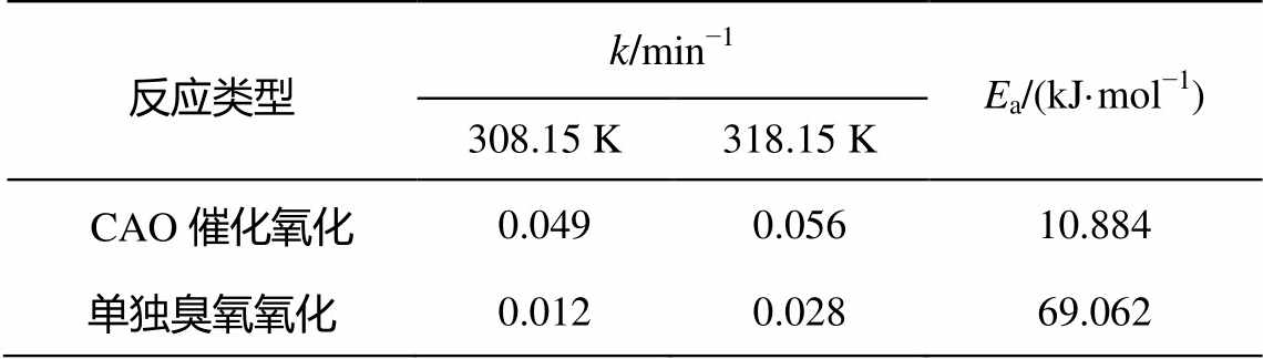 可以求出以CAO為催化劑的臭氧催化氧化過程在308.15和318.15K溫度下的反應(yīng)速率常數(shù)k以及反應(yīng)的活化能Ea, 如表4所示。同理, 可進(jìn)一步求出單獨(dú)臭氧氧化過程的k和Ea。結(jié)果顯示, 采用CAO催化該反應(yīng), 可以大大降低反應(yīng)所需的活化能, 由69.062kJ/mol降低至10.884kJ/mol, 降低幅度近 84.2%, 并且能將反應(yīng)速率提高2~3倍, 從理論上進(jìn)一步證明CAO催化劑良好的催化性能。